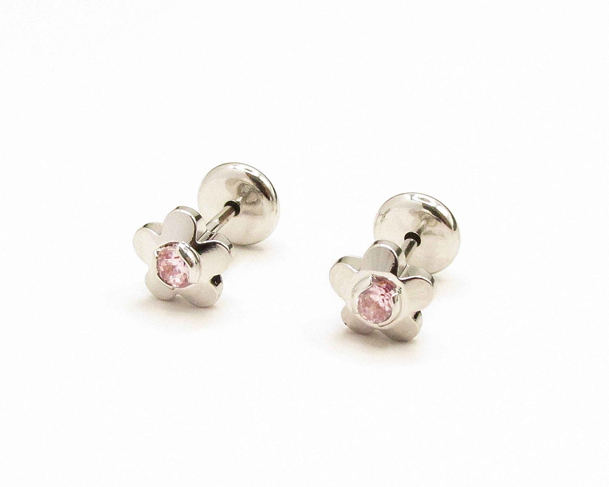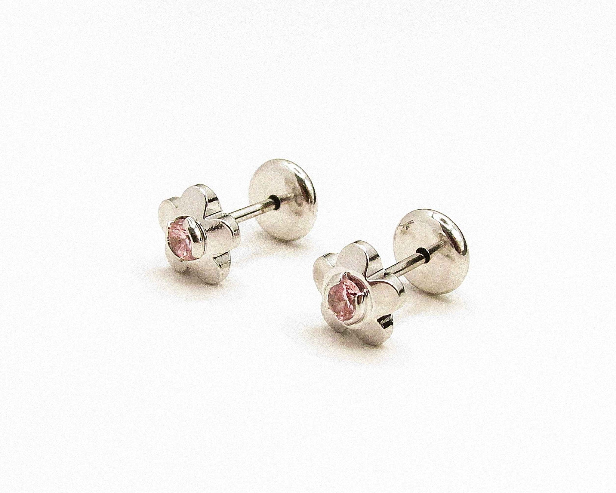 Aros para recién nacidos, con forma de flor, circon central rosado claro y tope especial plano.