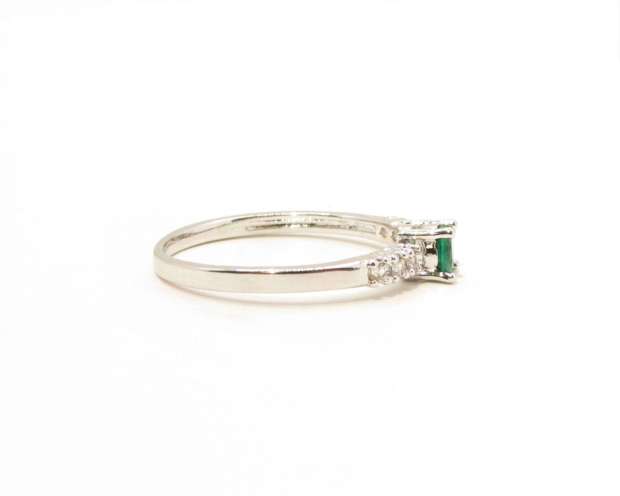 Anillo enchapado en oro blanco con circón verde esmeralda y circones laterales, diseño elegante. La piedra central redonda destaca por su color intenso verde, mientras los pequeños circones en los costados aportan brillo y sofisticación. Ideal como anillo de compromiso, anillo de regalo o joya elegante para uso diario.