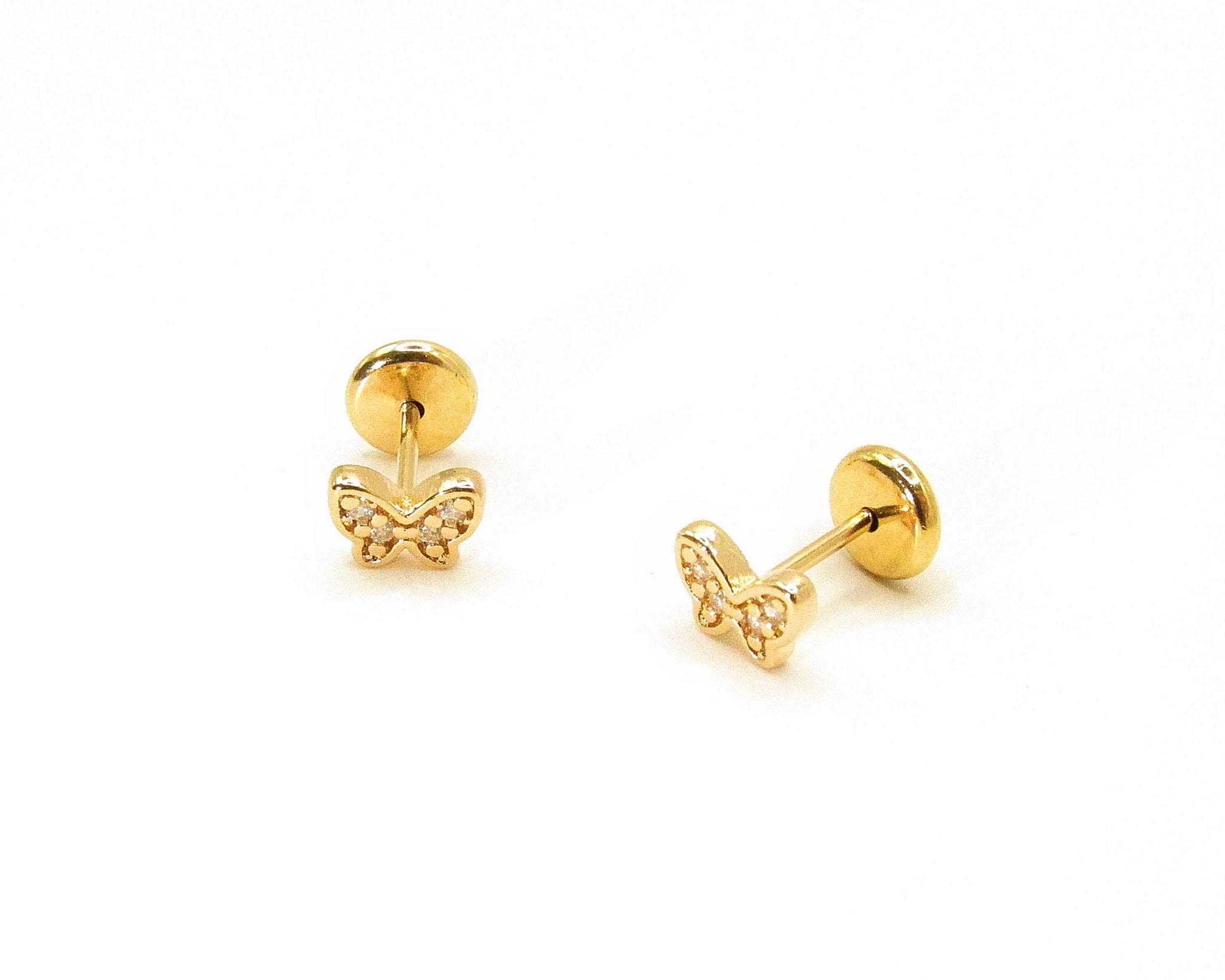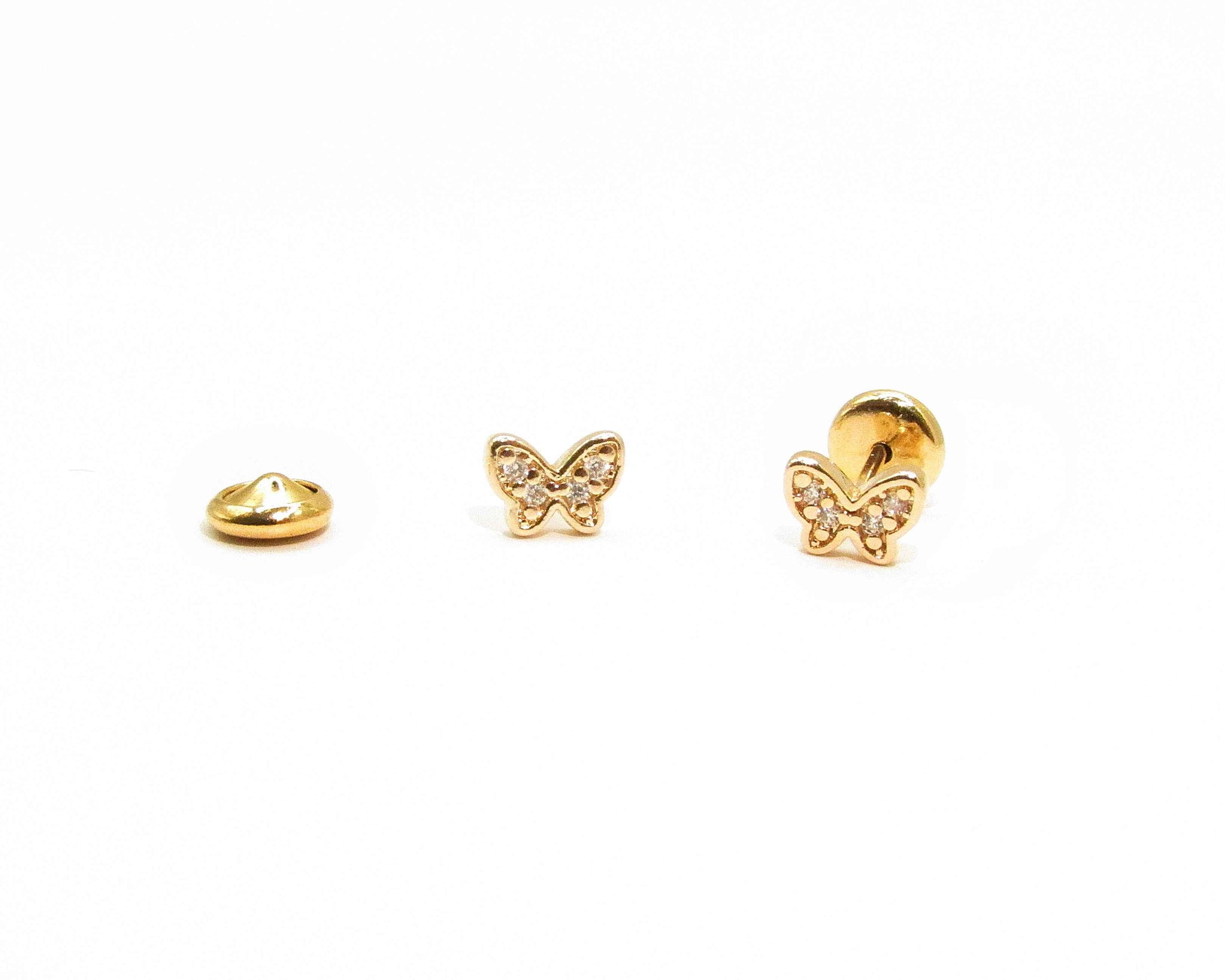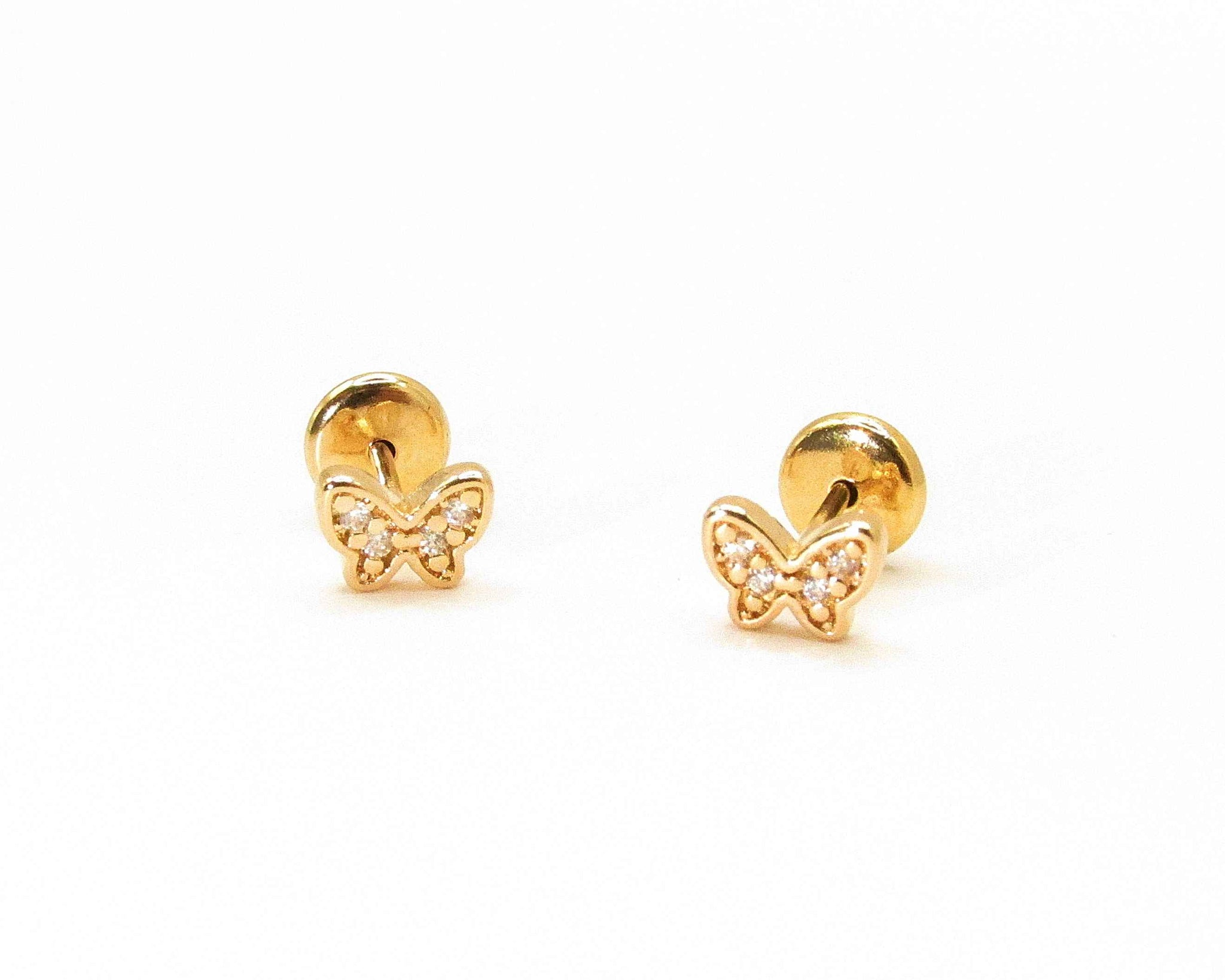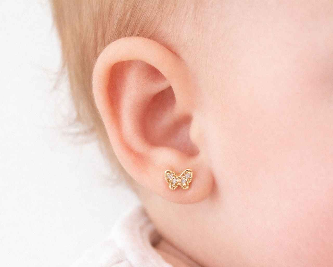 Delicados aros abridores para bebé con diseño de mariposa, ideales para primeras perforaciones. Fabricados en enchapado de oro 18K de alta calidad, con brillantes circones que aportan un toque sutil y elegante. Su cierre tipo abridor brinda seguridad, comodidad y ajuste perfecto para el lóbulo de bebés y niñas.