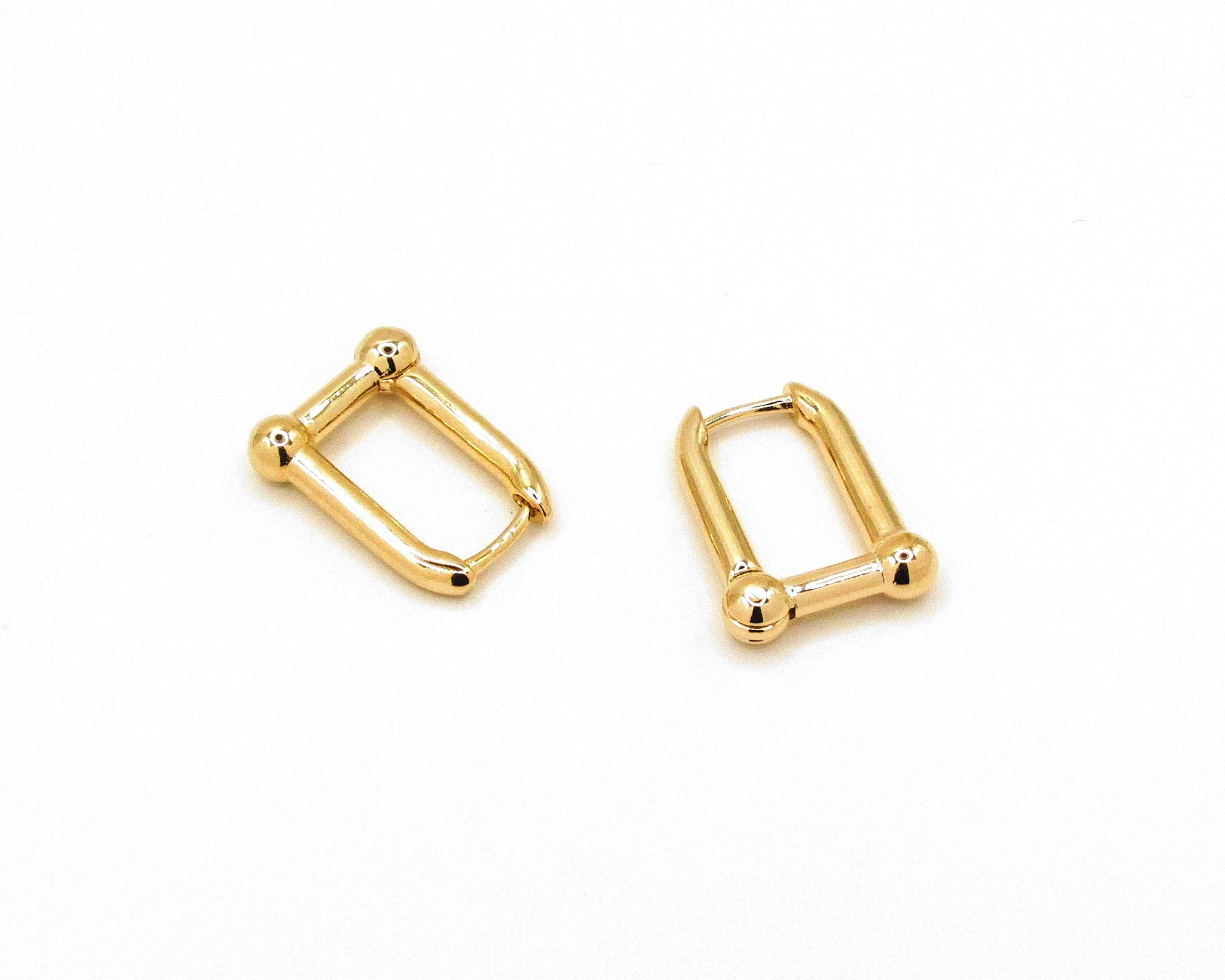 Aros rectangulares diseño moderno con barras redondeadas y puntas tipo esfera que les dan un estilo elegante y minimalista. Su estructura es firme y liviana, con cierre a presión cómodo y seguro para uso diario.