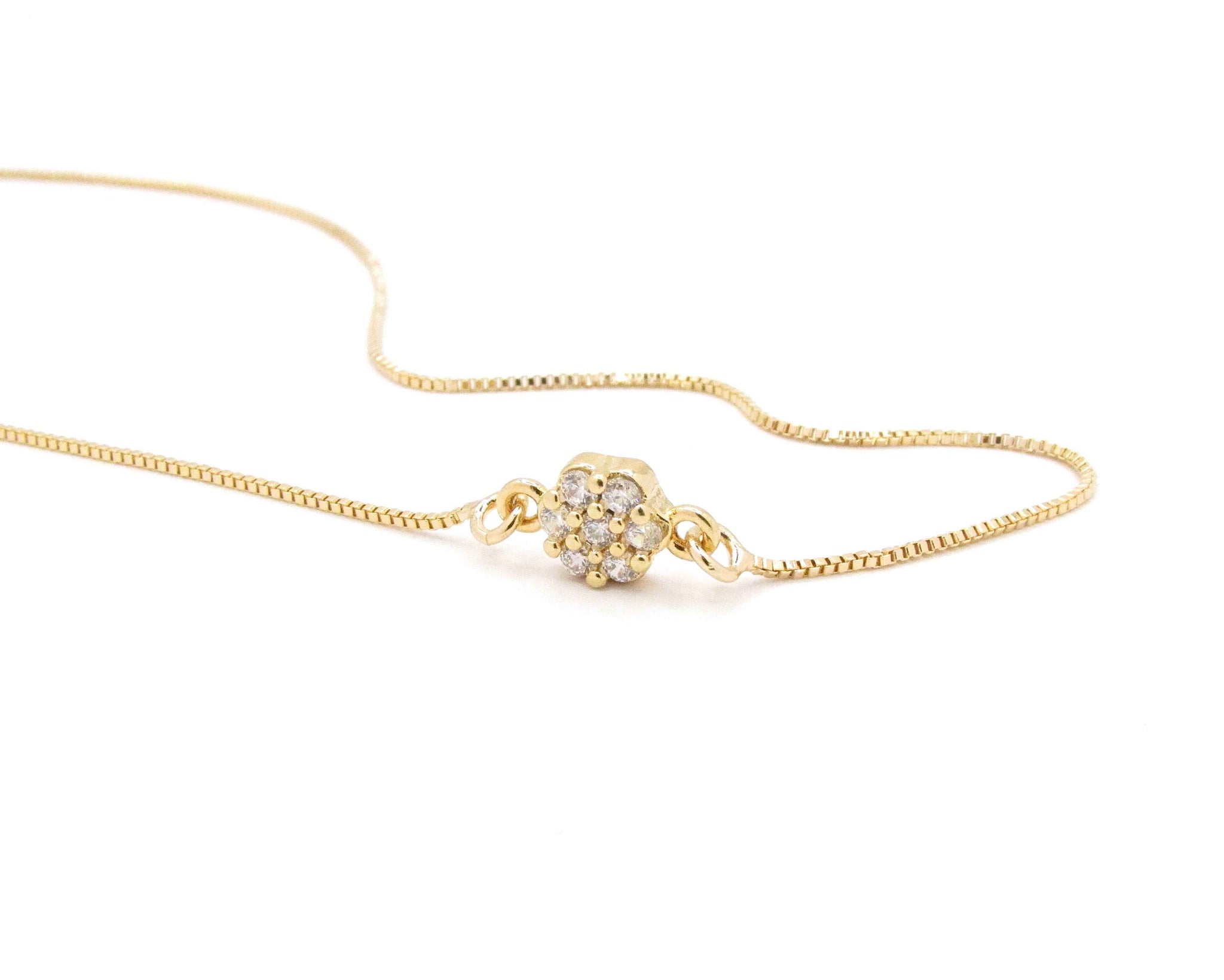 Collar delicado enchapado en oro con cadena tipo veneciana y colgante central en forma de flor, compuesto por circones brillantes que aportan un acabado fino. Su diseño minimalista y elegante lo convierte en una pieza ideal para uso diario o para complementar looks más formales.
