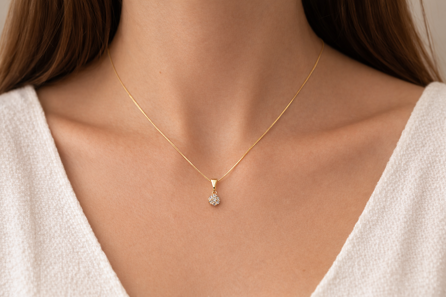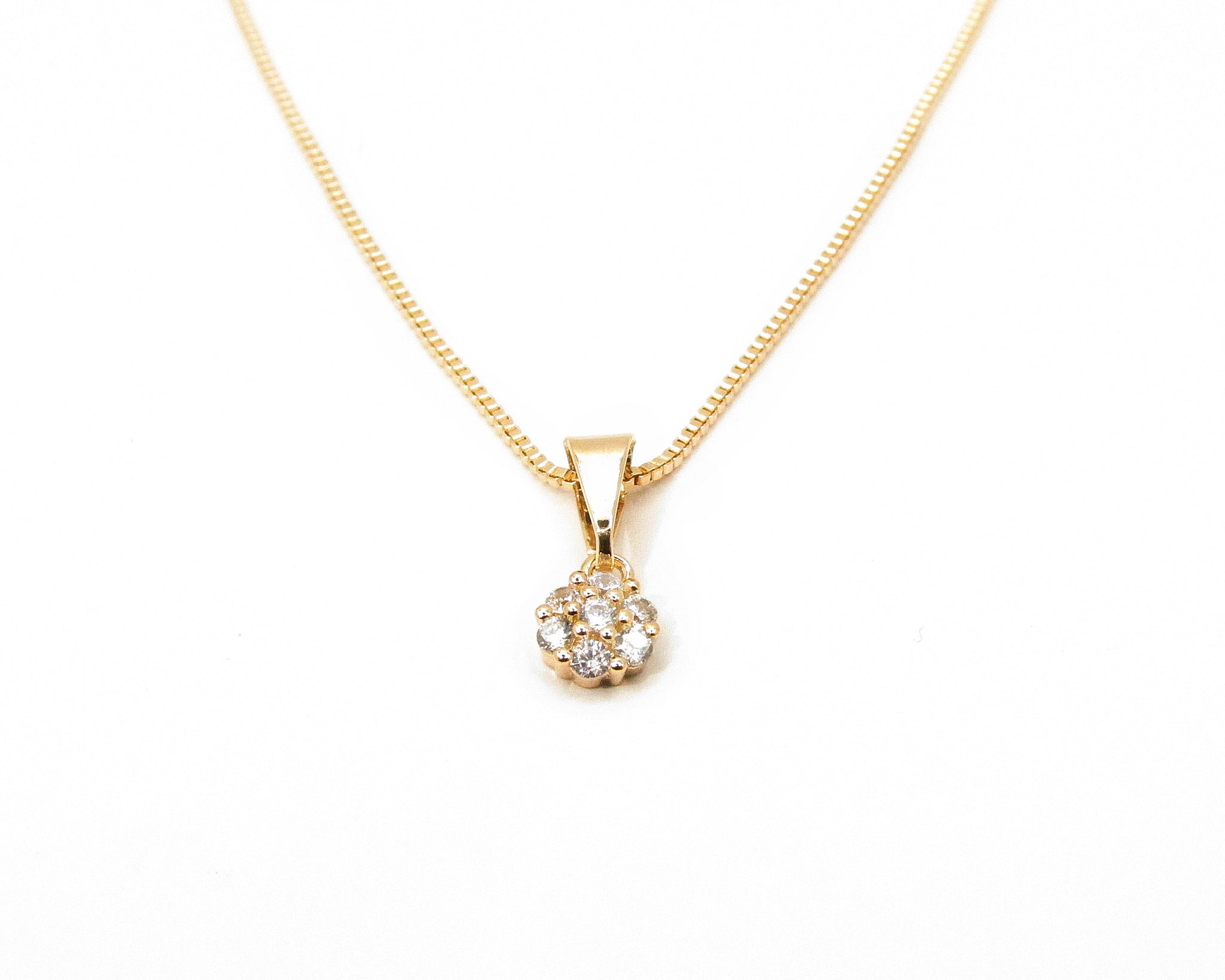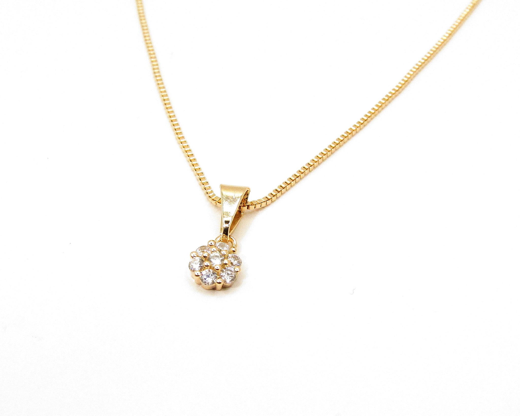 Delicado collar enchapado en oro 18K con cadena veneciana y un elegante colgante tipo punto de luz floral. El colgante de 5.5 mm de diámetro está compuesto por pequeños circones brillantes que forman un diseño redondo luminoso, ideal para aportar un toque sutil de elegancia y brillo al cuello.