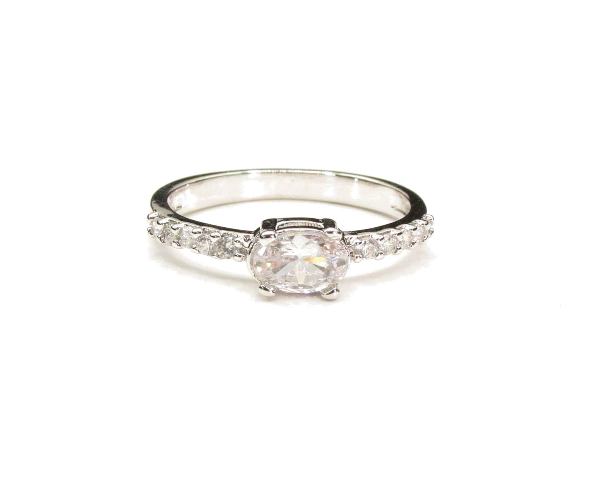 Anillo liso con un circón solitario central ovalado de 6.5 mm x 4 mm de diámetro y cinco circones a cada lado de 2 mm