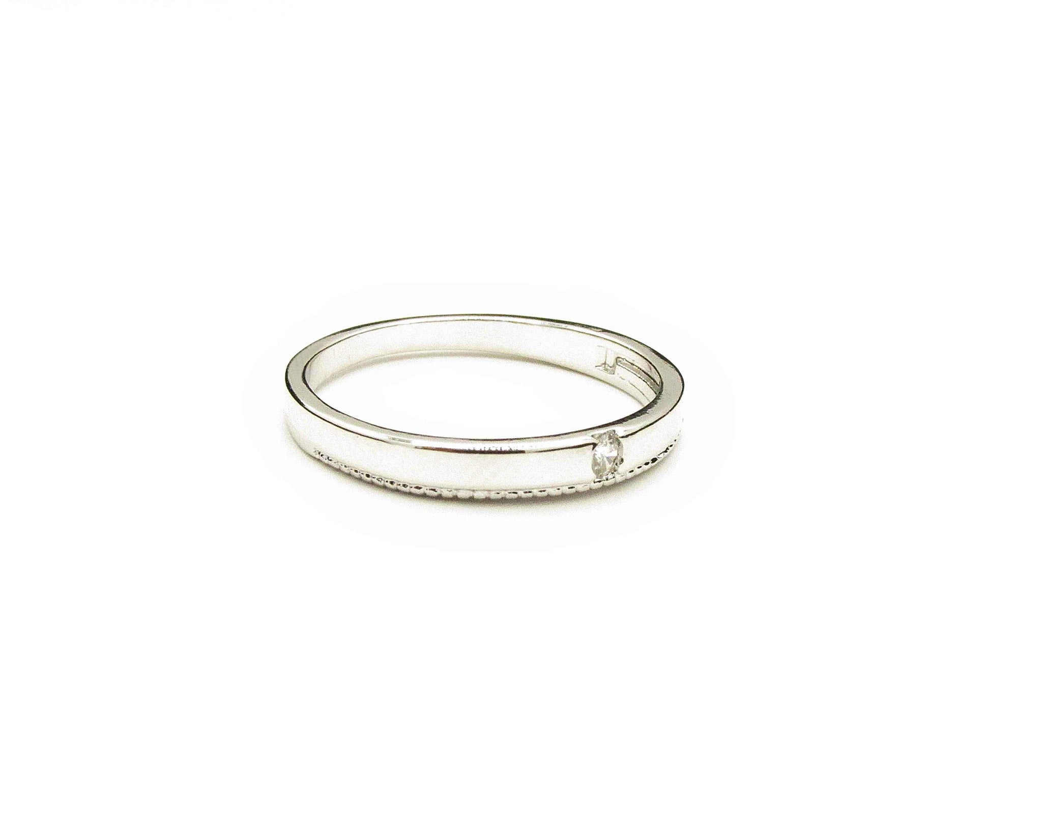 Anillo enchapado en oro blanco con un diseño delgado, elegante y minimalista, acompañado de un circon brillante engastado al frente. Su borde superior incluye un delicado tallado que aporta textura y un acabado sofisticado sin perder la simpleza del aro liso.