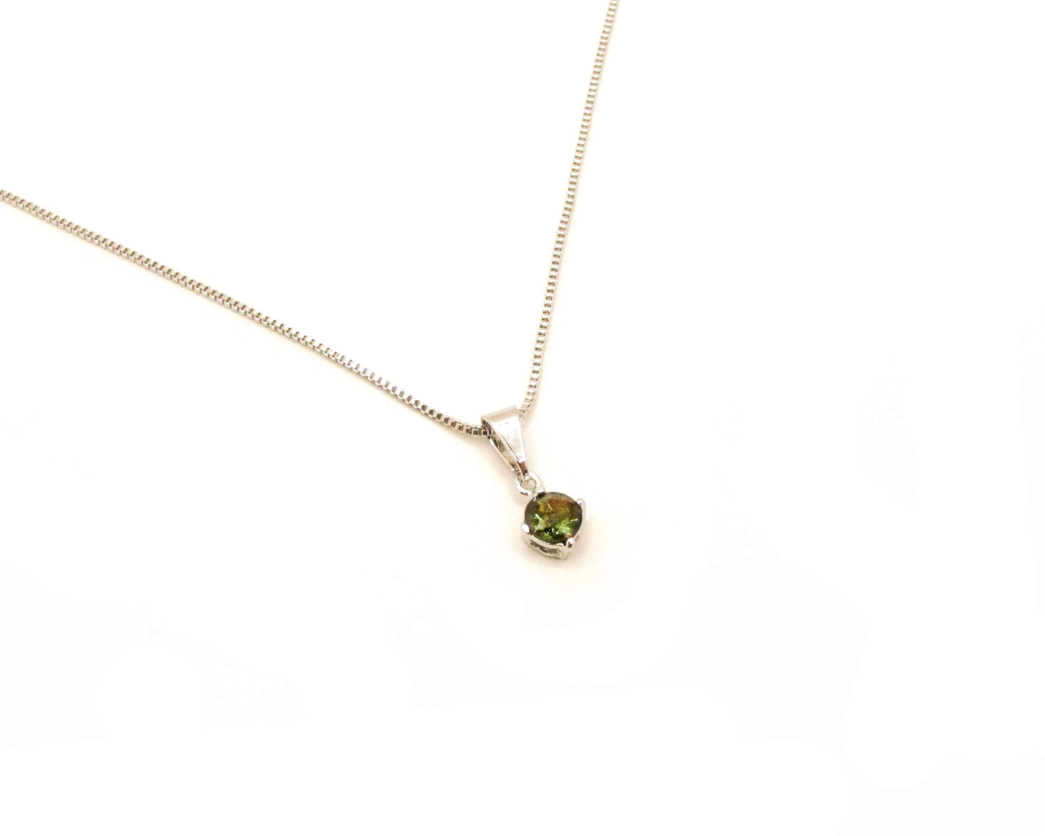 Este collar presenta un colgante con circon Verde oliva oscuro redondo de 5 mm, engastado en un delicado soporte que realza su brillo natural. La cadena veneciana, de acabado pulido, aporta una línea limpia y moderna que complementa a la perfección su tono de oro blanco.