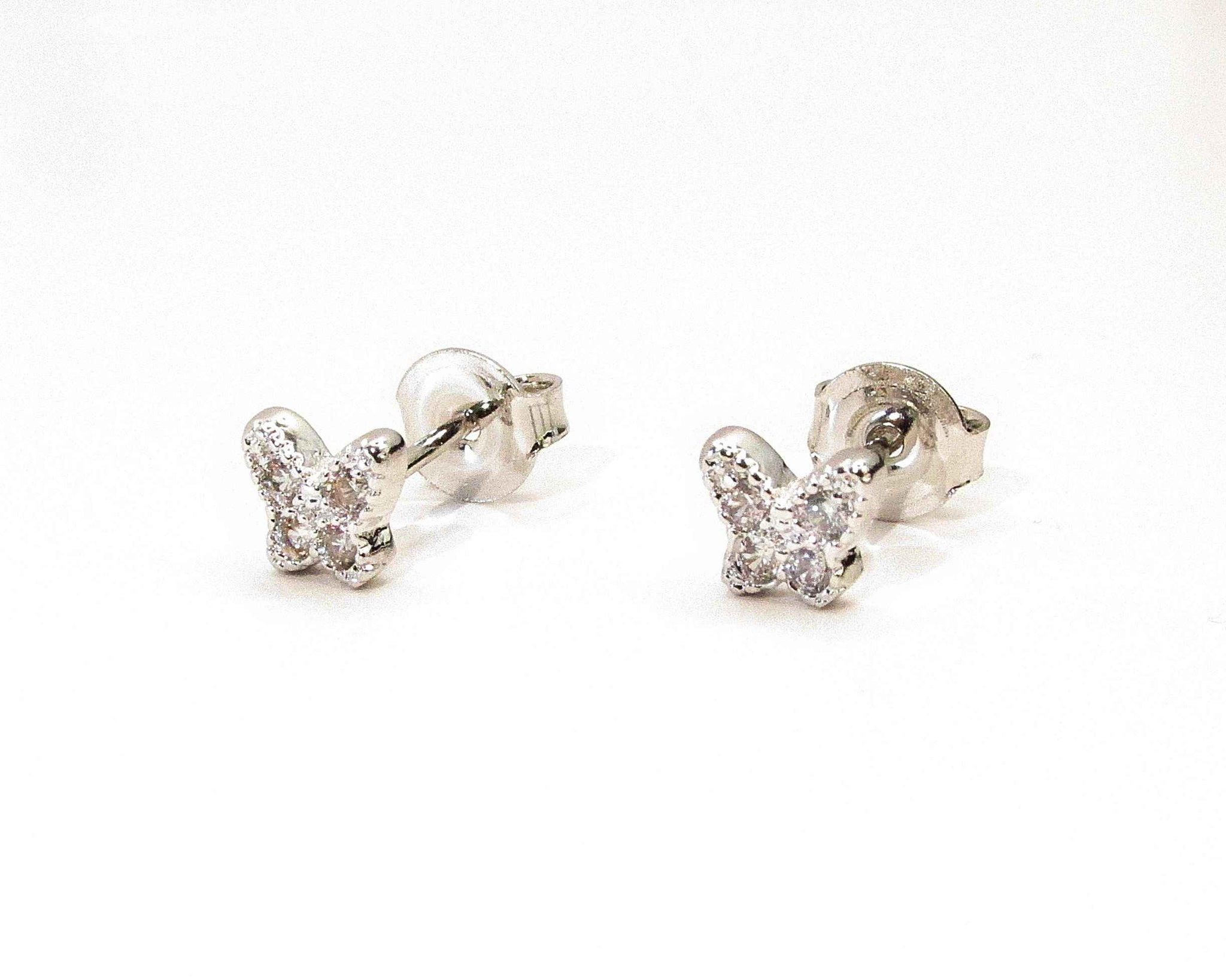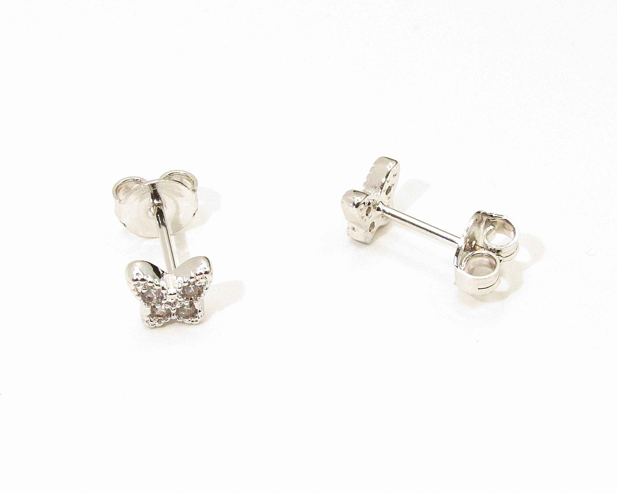 Aros mini mariposa, mini circónes blancos y tope tradicional mariposa.