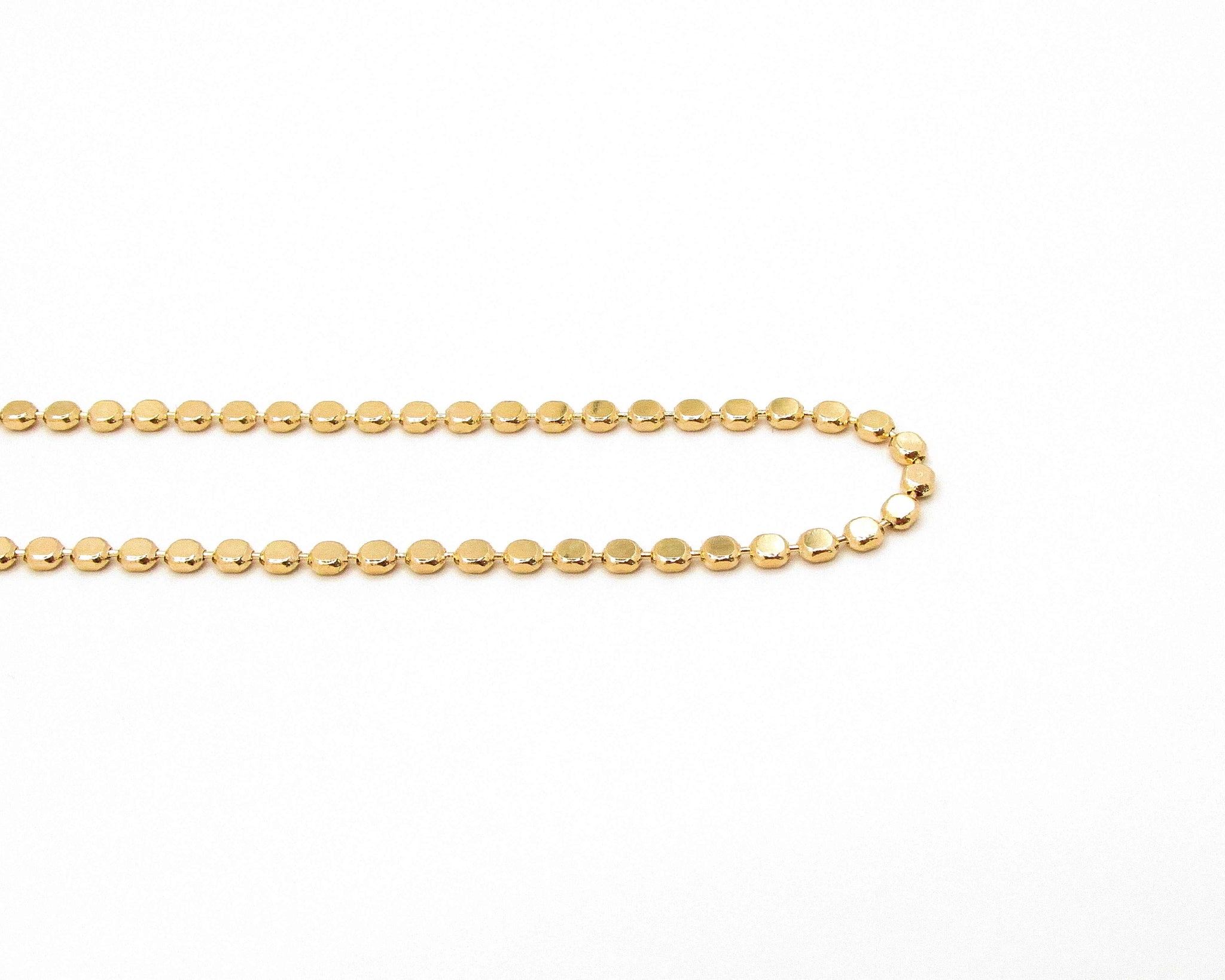 Encuentra esta cadena cuentas planas enchapada en oro en La Joyería Chile, con envío a todo Chile. Perfecta como cadena para layering, para combinar con colgantes y para quienes buscan joyas resistentes al agua, hipoalergénicas y con estilo actual.