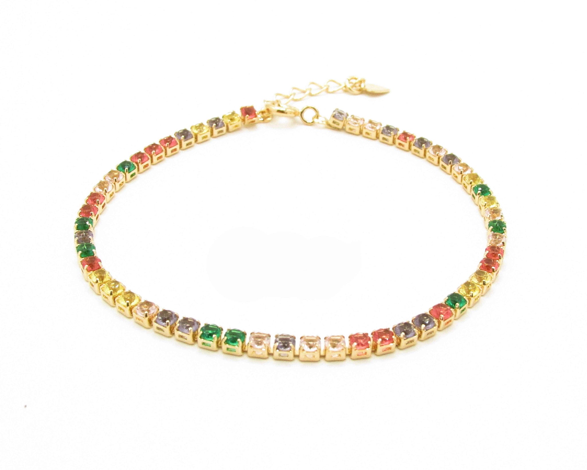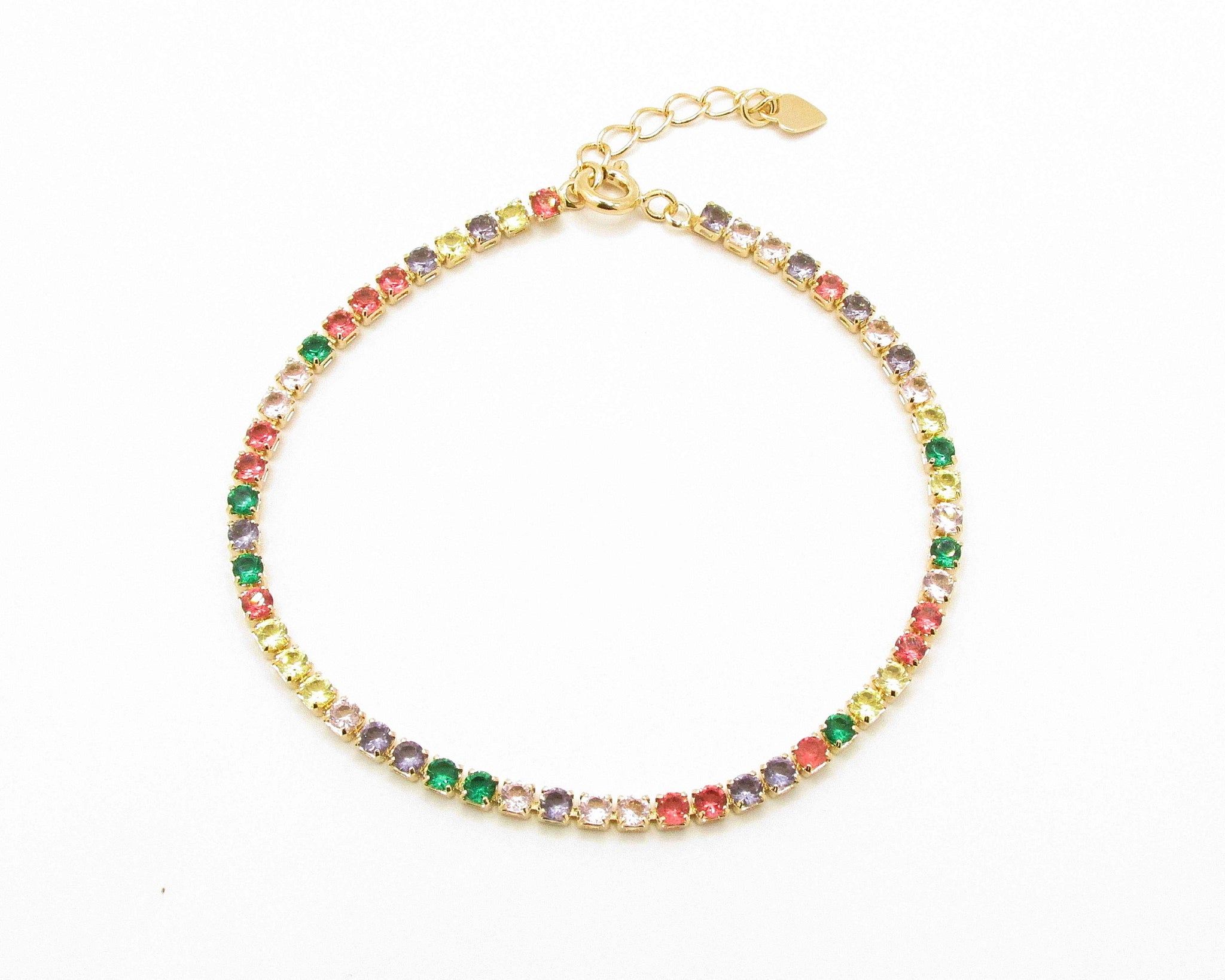 Este diseño tipo tennis incorpora circones cúbicos multicolor cuidadosamente engastados, creando un efecto luminoso y alegre en cada movimiento.