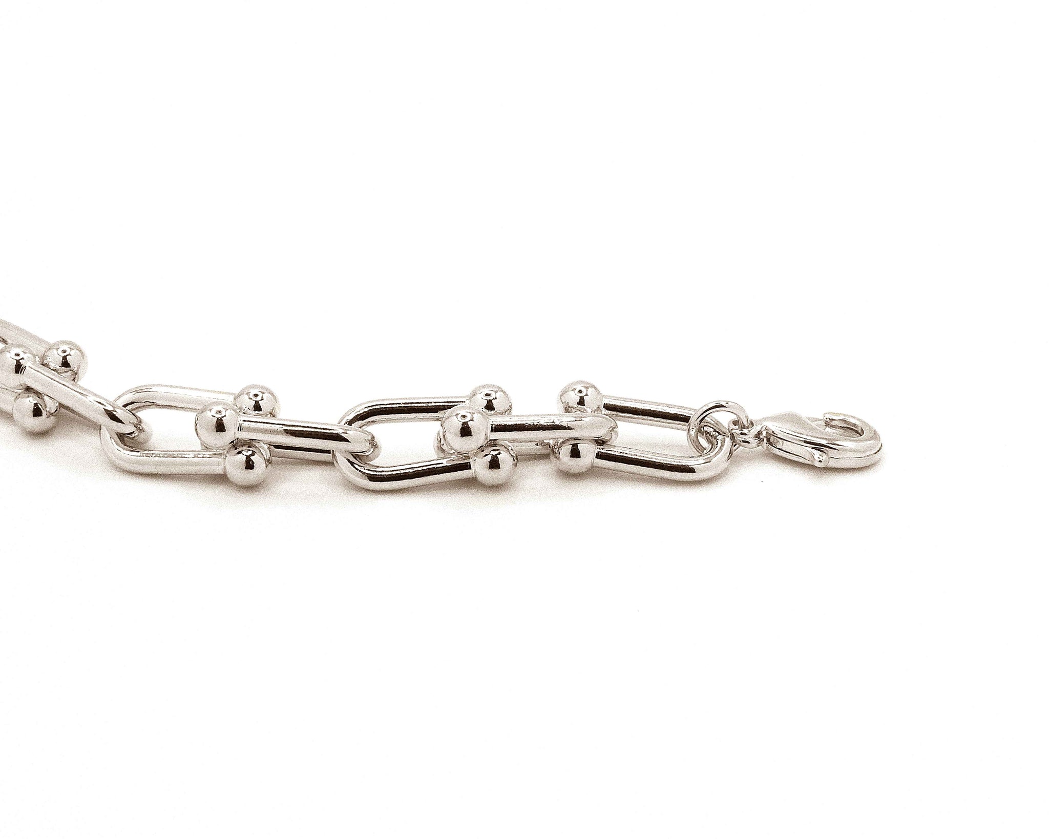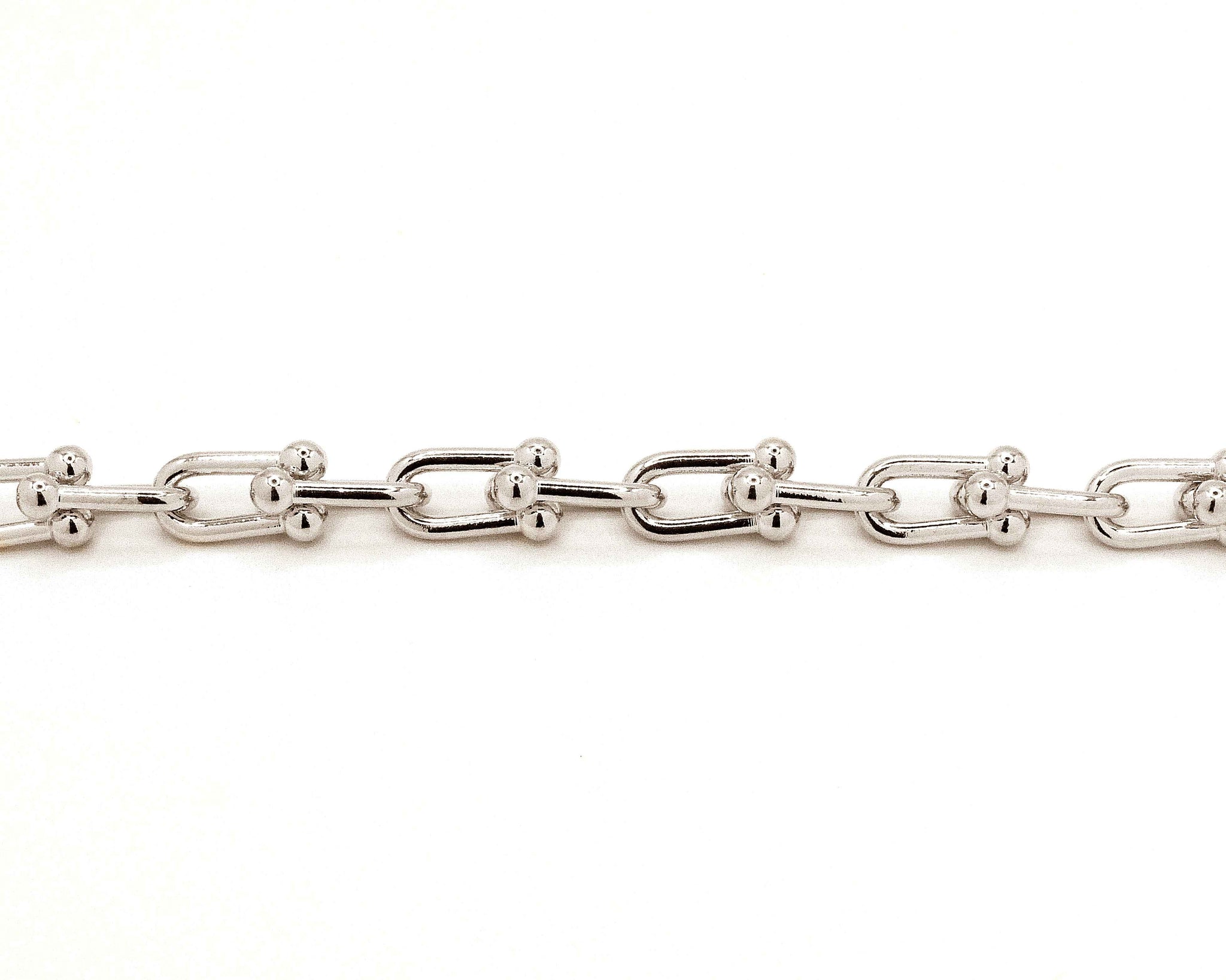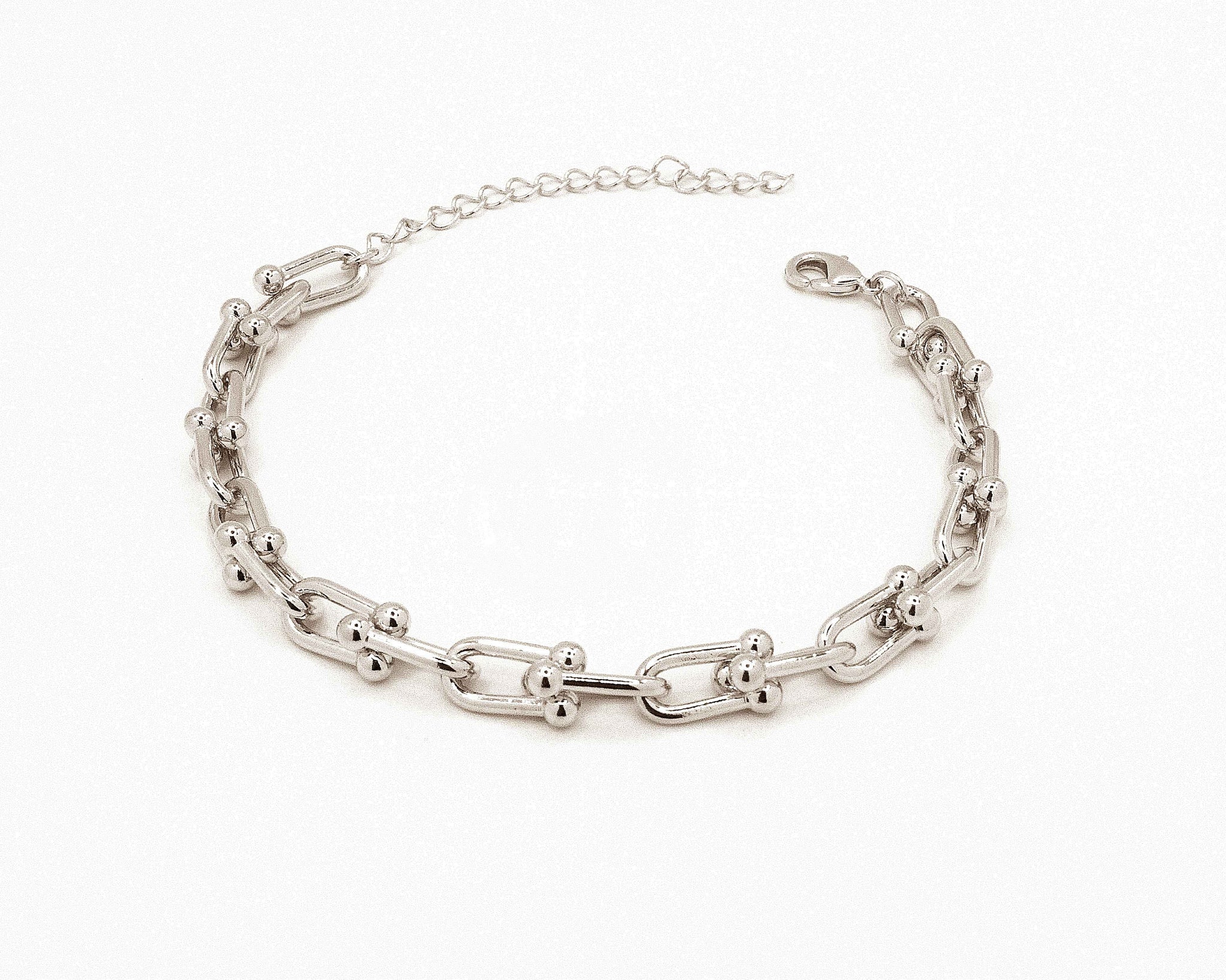 Pulsera tipo eslabón, elaborada con eslabones rectangulares de contornos suaves y redondeados. Cada eslabón está adornado con pequeñas esferas pulidas que aportan un toque distintivo y moderno
